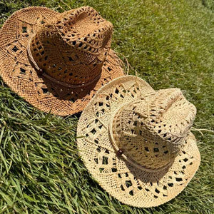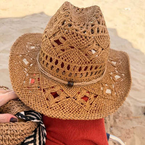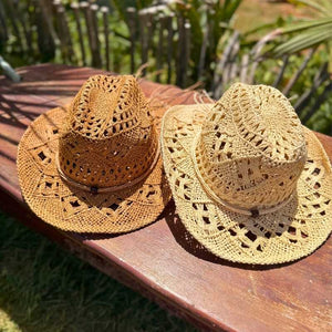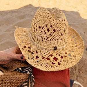 O Chapéu de Praia Cowboy Virginia traz o charme do estilo western clássico com uma leitura leve e sofisticada para o verão. Feito em palha natural vazada, ele combina ventilação, conforto e personalidade - ideal para quem busca proteção solar sem abrir mão do estilo.