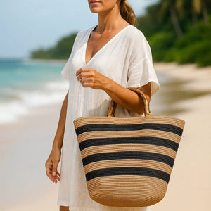 Versátil e funcional, a Bolsa de Praia Palha com Alça de Bambu é perfeita para diferentes ocasiões — de um dia relaxante à beira-mar a um passeio em clima tropical. Seu acabamento em palha natural com listras neutras combina facilmente com biquínis, saídas de praia e vestidos leves.